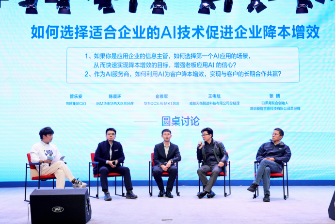 圆桌会议期间,帝欧集团CIO管乐安,IBM华南华西大区总经理陈震环,华为DCS AI MKT总监俞雅军,成都天衡智造科技有限公司总经理王伟旭,白泽尧联合创始人/爱瑞古德科技有限公司总经理张腾,等专家就“如果你是应用企业的信息主管,如何选择第一个AI应用的场景,从而快速实现降本增效的目标,增强老板应用AI 的信心?”阐述了各自的观点。大家一致认为,人工智能AI的应用日益广泛,应用前景广阔,但在企业推广应用,必须讲究方式方法,针对企业的实际情况,优先首选哪些投资小、见效快的场景,同时必须做精做透,挖掘场景应用AI可以实现的所有目标,保证项目一次性成功,取得管理层的认可,从而增强管理层的进一步深入开展AI应用的信心!